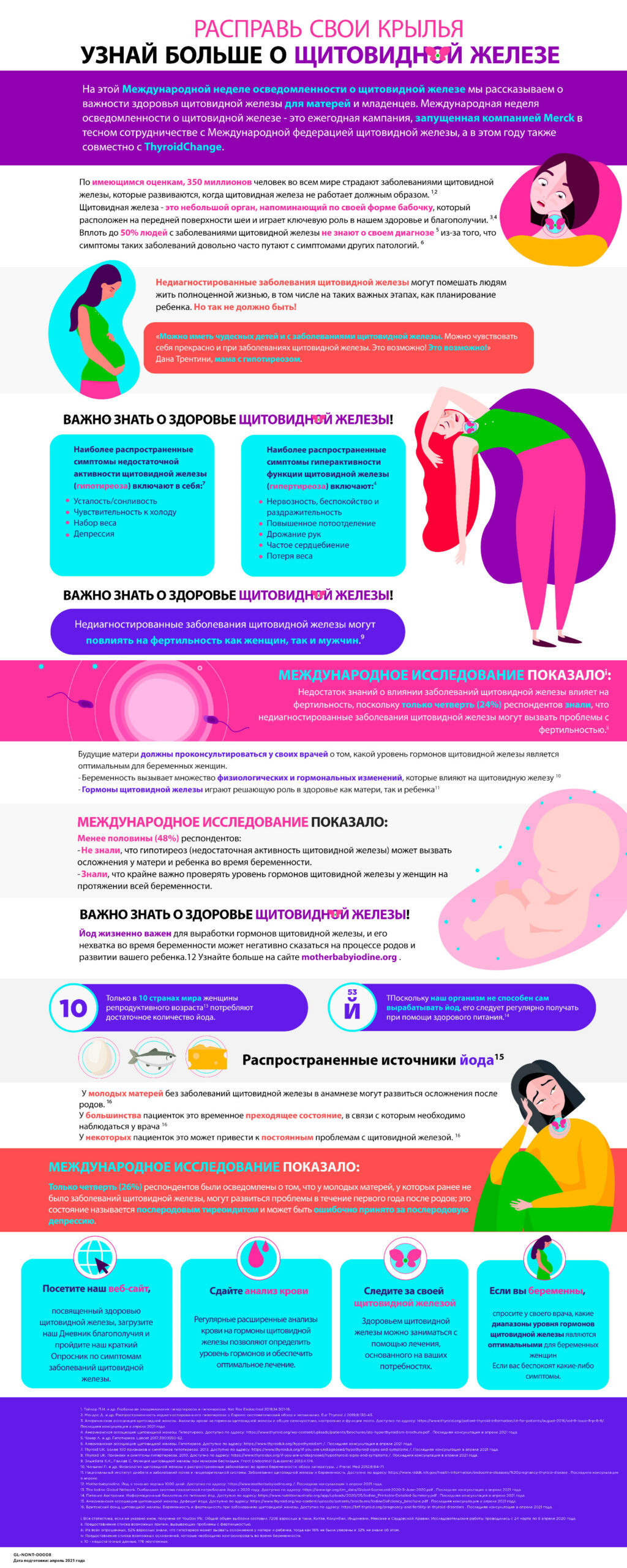 Наша инфографика «Расправь крылья» помогает людям узнать больше о щитовидной железе. Читайте и делитесь информацией о проявлениях болезней щитовидной железы и их влиянии на здоровье женщин и детей. Хотите проверить, нет ли у вас проблем с щитовидной железой?